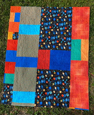 I mentioned a couple posts ago about how I'm involved with a local preschool. For a fundraiser, I made an I-Spy quilt to raffle off (and posted pictures). I had more t-shirts and more fabric, so I figured I'd make more to raffle off each year until I ran out of t-shirts. This is a second quilt, supposedly for the next fundraiser, but I got this quilt done the night before the raffle, so the winner got to choose which quilt they wanted. This one was chosen, so the first one will be raffled off next year.