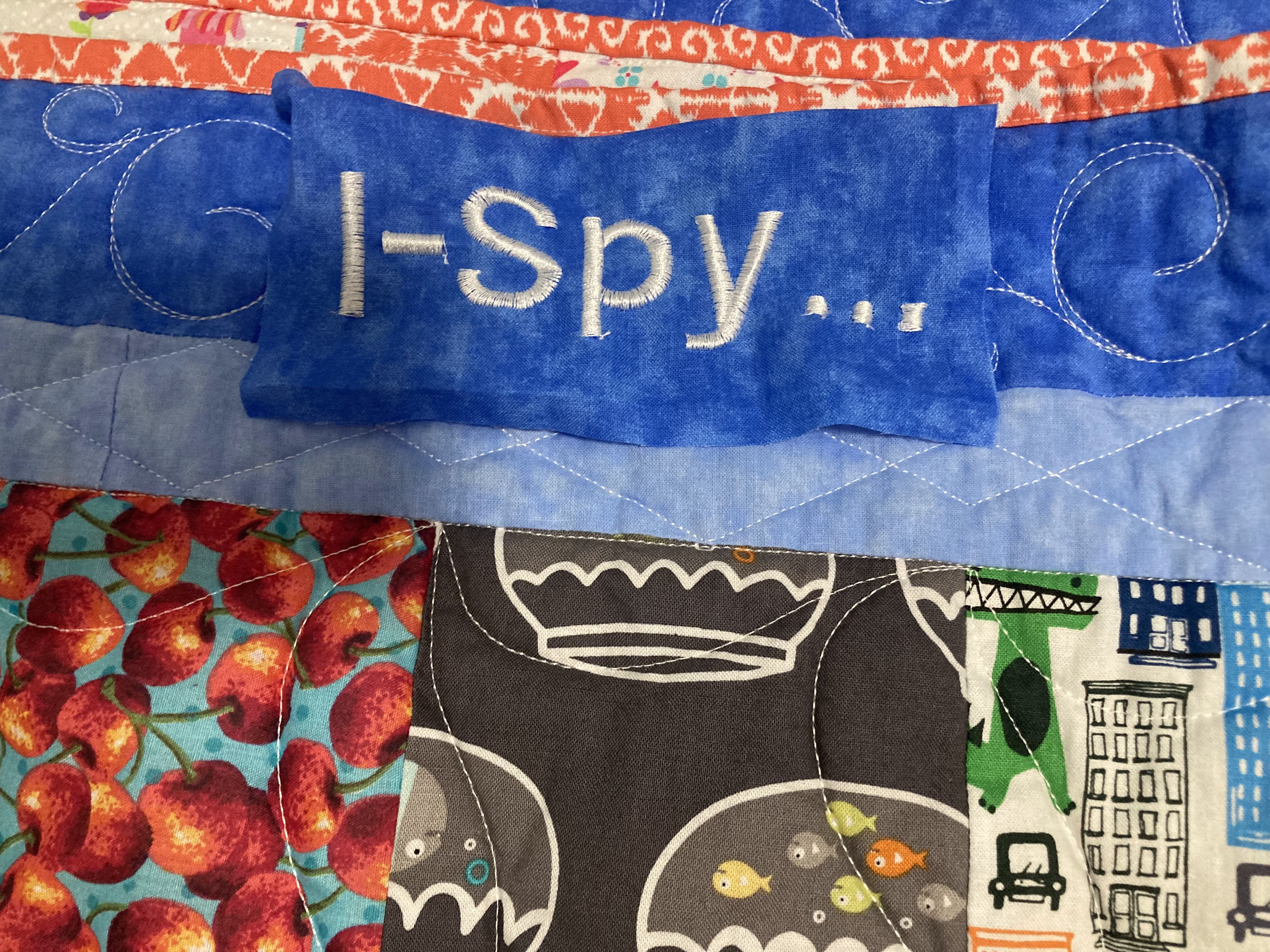As I took a photo of the quilt, I noticed there was a stain in the top border. What?! So I used a new stain remover (bad idea, but I was in a hurry - Dad always said, "Lazy people work the hardest") and it took off some of the coloring. PANIC! My sister had the idea of patching over it, and after some brainstorming and more thought, I embroidered "I-Spy..." on left over blue fabric, cut to size,