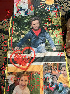 Another unusual client request that took more thinking and planning than the actual sewing. She had a baby sized afghan her mother had made as well as 2 thin towels with grandkids’ photos printed on them. One towel was too tall, so the top 2 items needed to be appliquéd elsewhere - one into the center of the heart and the sun into the sky of the central photo, then the whole towel sewn to one side of the afghan. The other towel was to be made a little smaller and sewn to the center of the other side. (See the next two photos.)